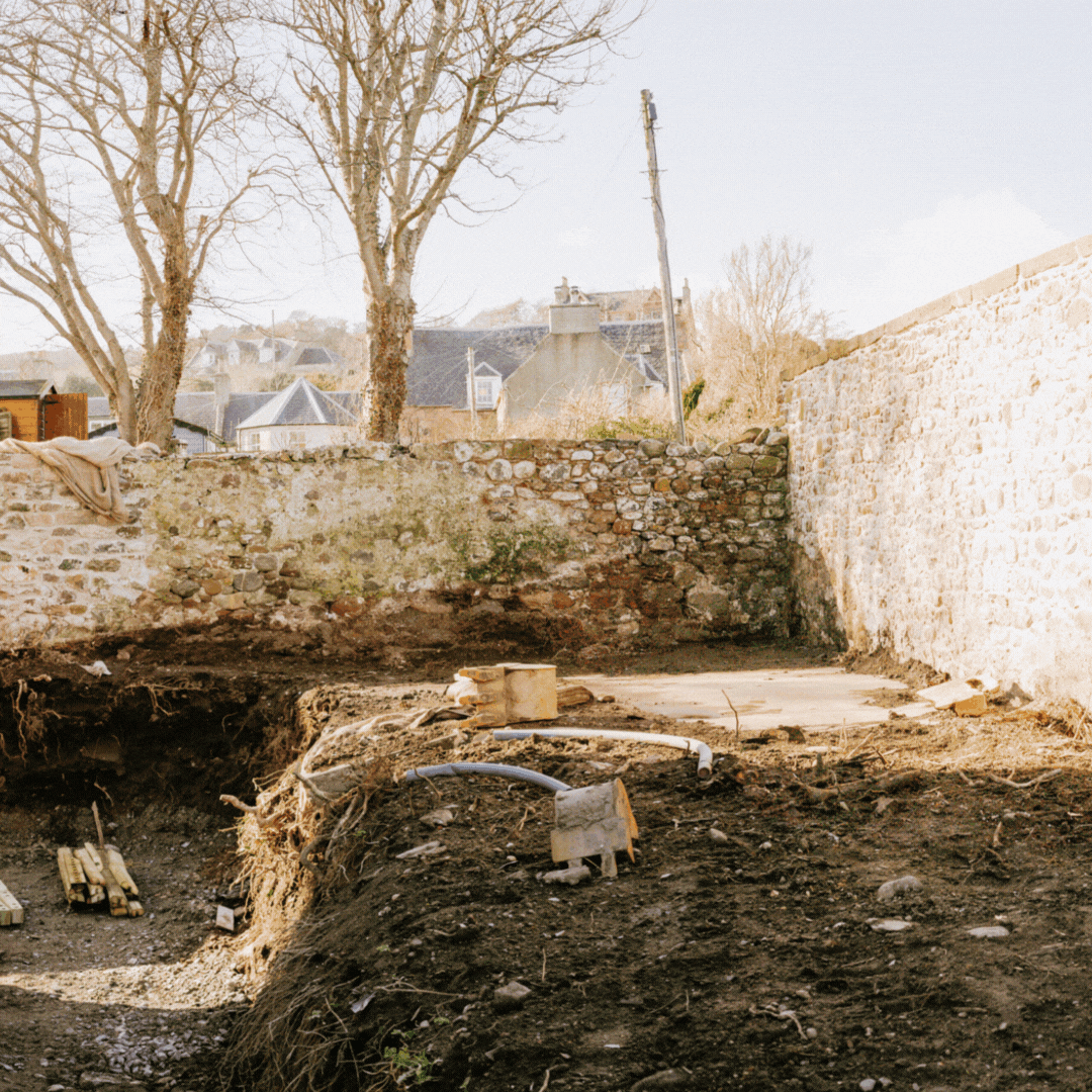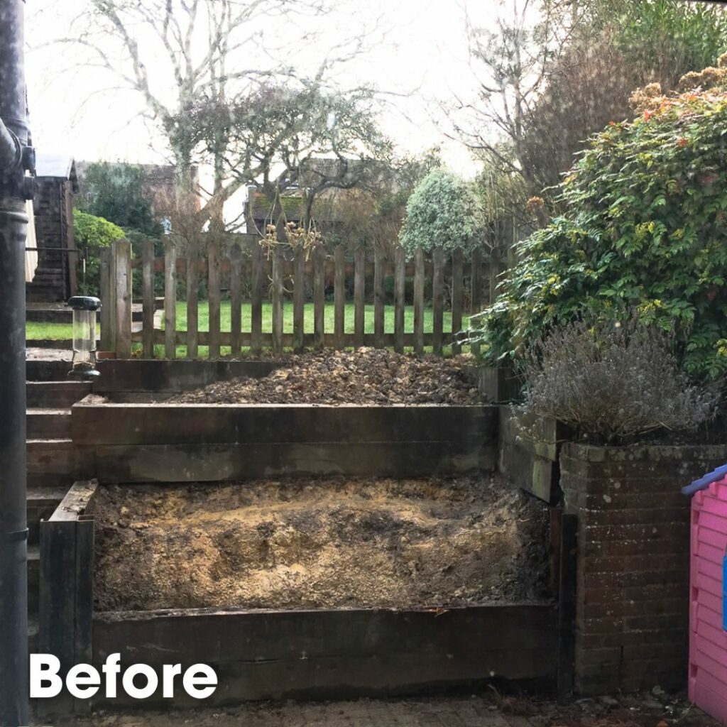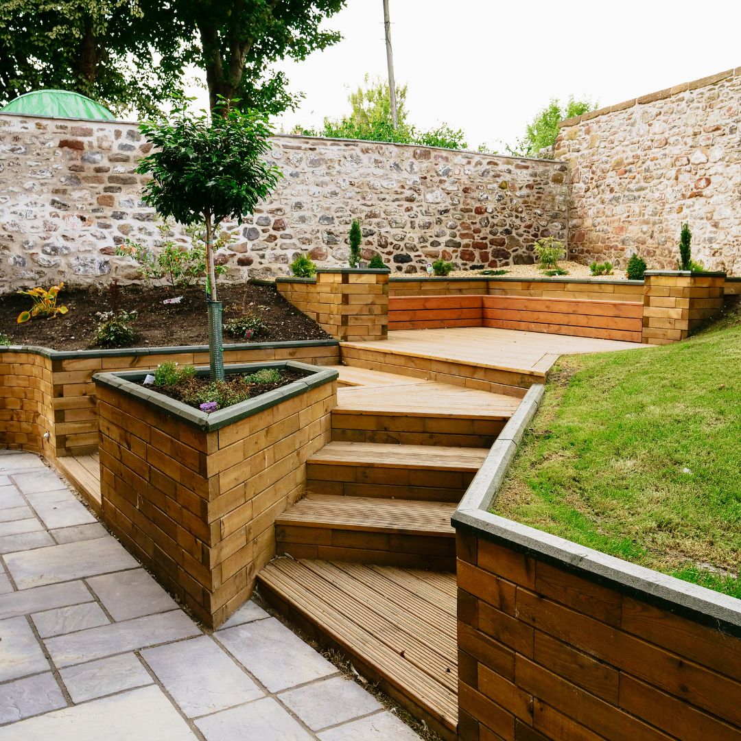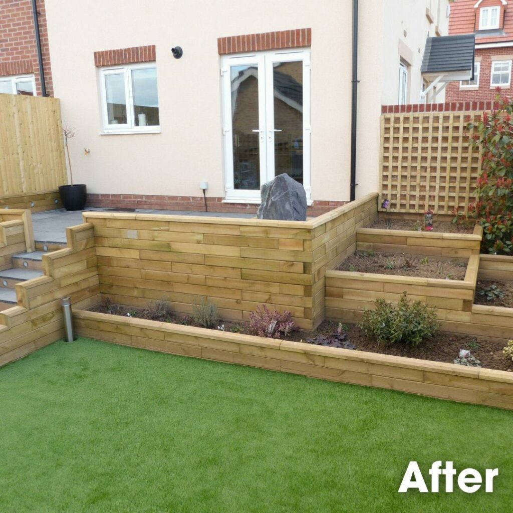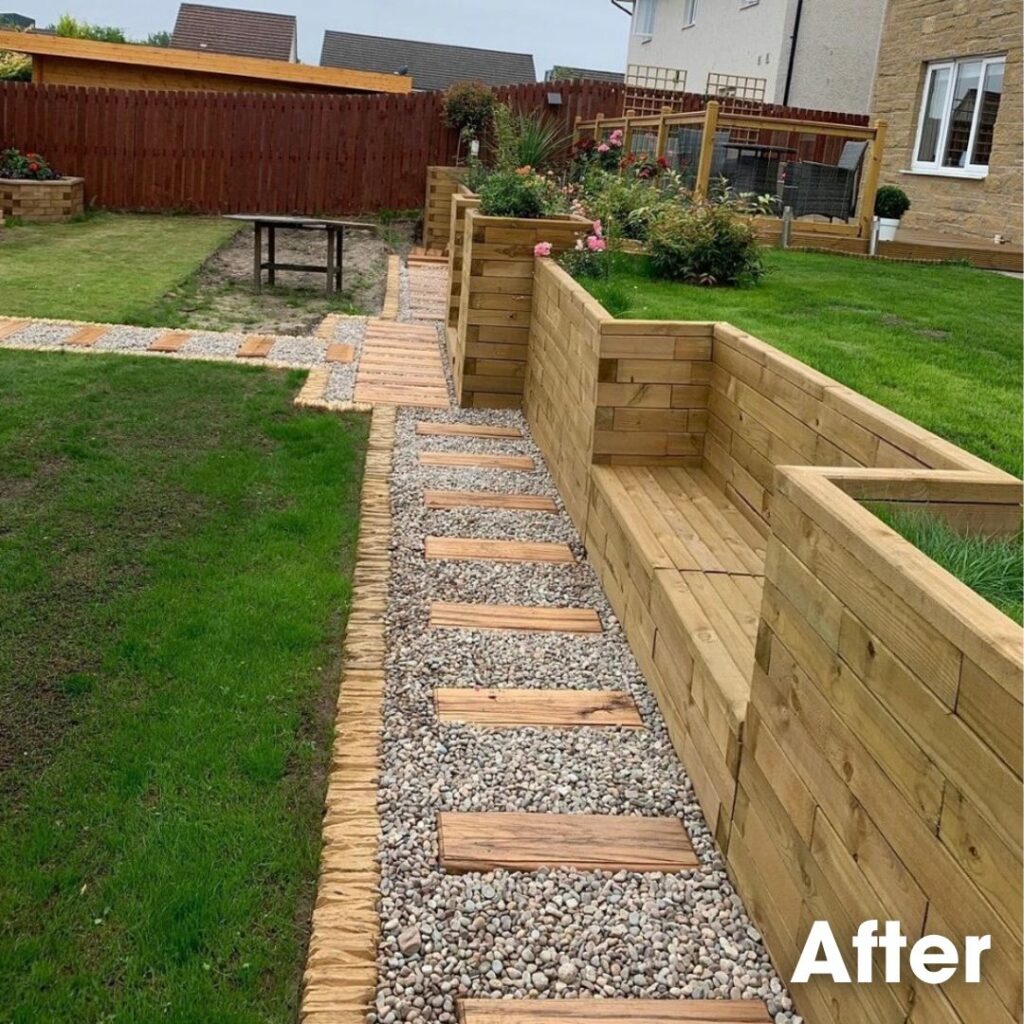 Her er hele haven blevet renoveret med skræddersyede støttemure, trin og plantekasser, som gør området mere tilgængeligt. Hvert element er designet i samarbejde med vores gratis designservice og passer perfekt til området.