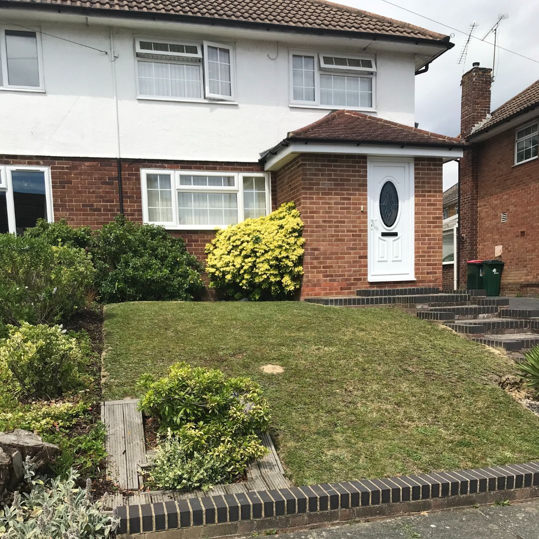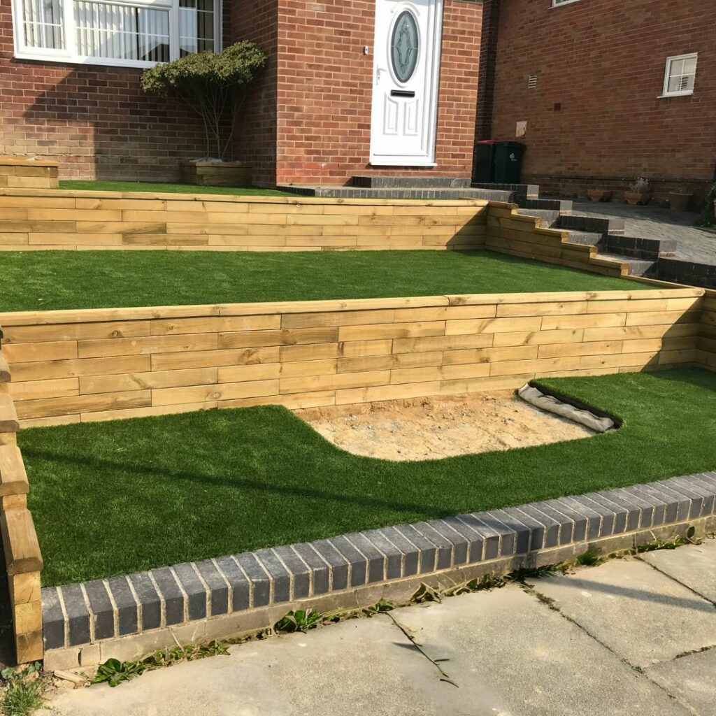 Denne forhave havde en stor skråning, som gjorde det nærmest umuligt både at bruge og slå græsplænen. Skråningen blev ombygget med et design med skræddersyede WoodBlocX-støttemure med en dekorativ kant, som følger havens samlede hældning.