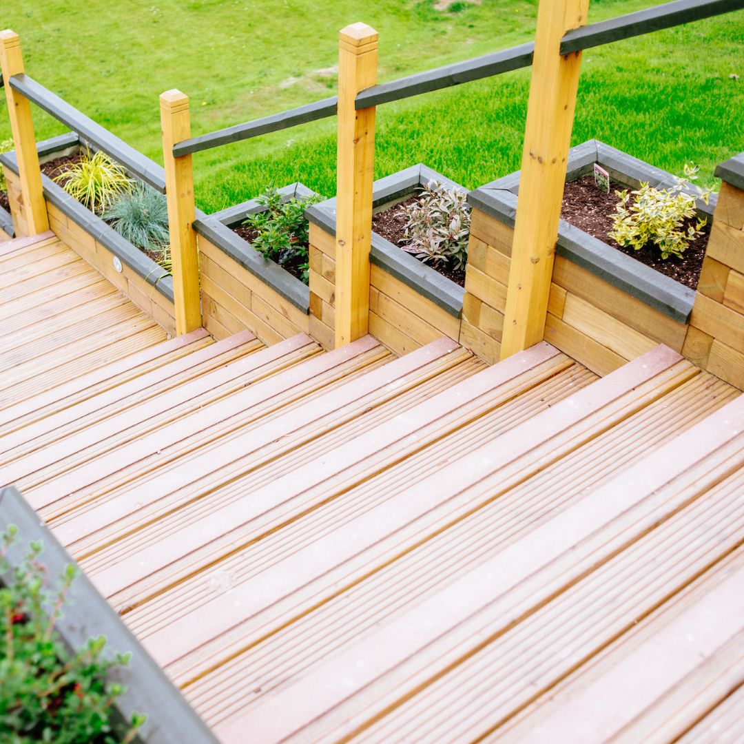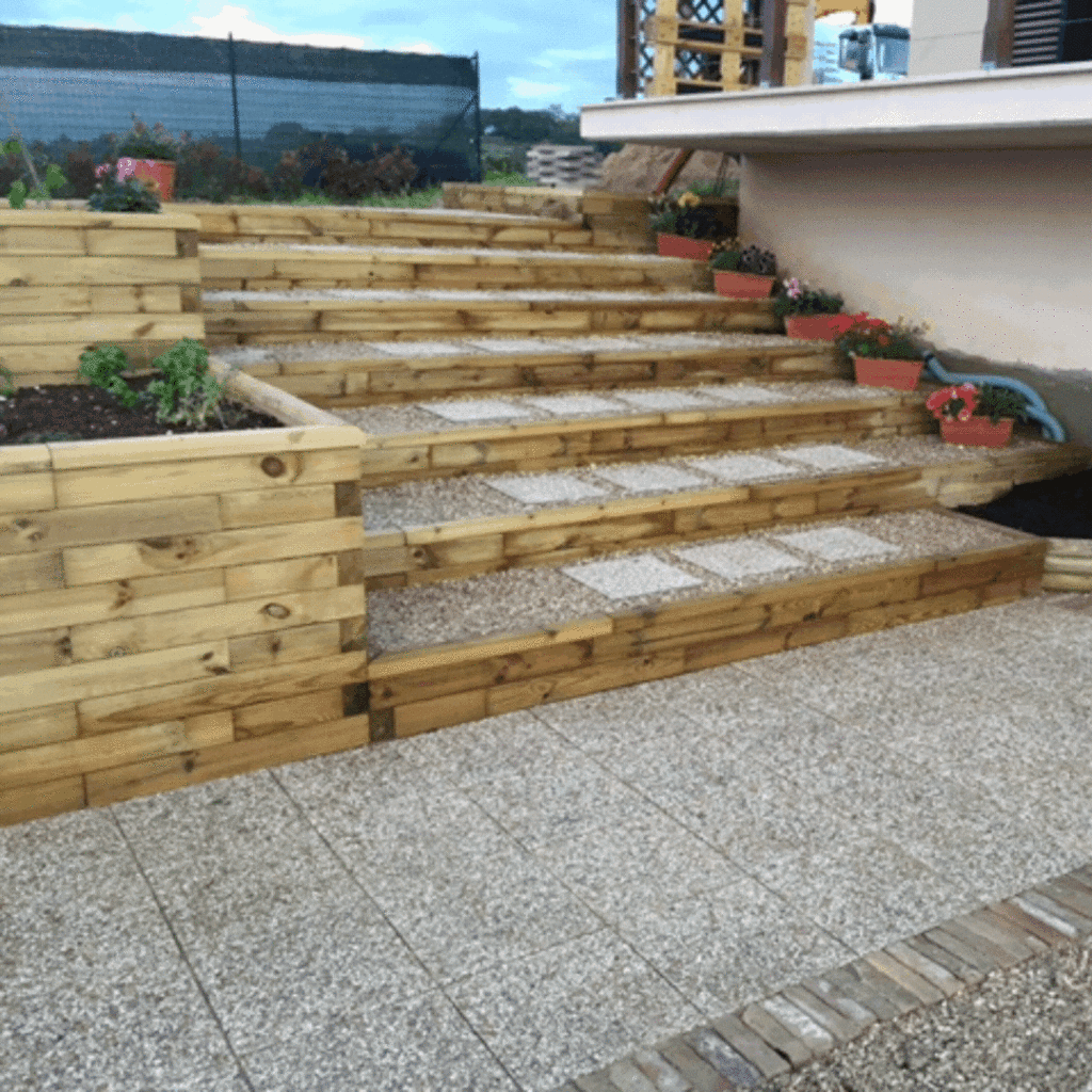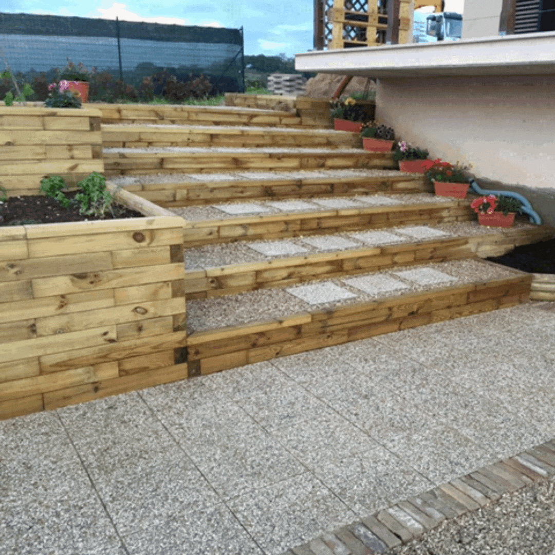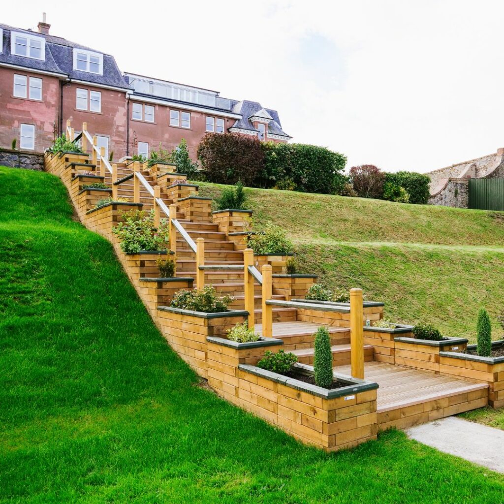 Det er nemt at bygge trin med WoodBlocX. Det gælder, uanset om de skal passe ind i et bestemt område, eller om de skal fungere som en separat trappe. Denne kombination af plantekasser og trin giver nemmere adgang mellem toppen og bunden af en stor og meget stejl have.
