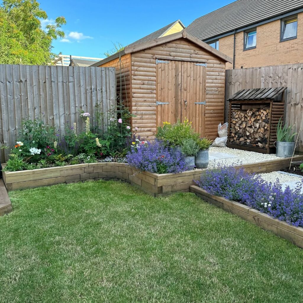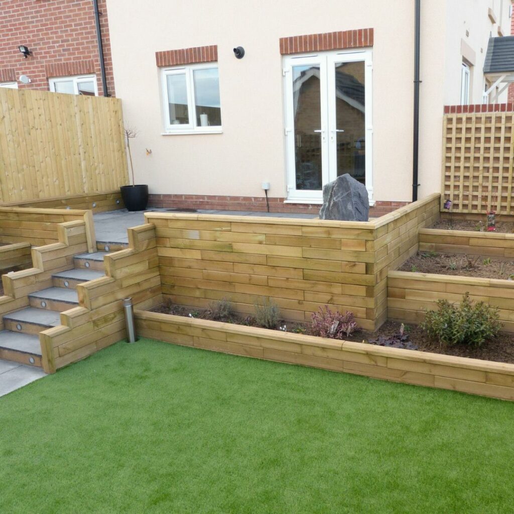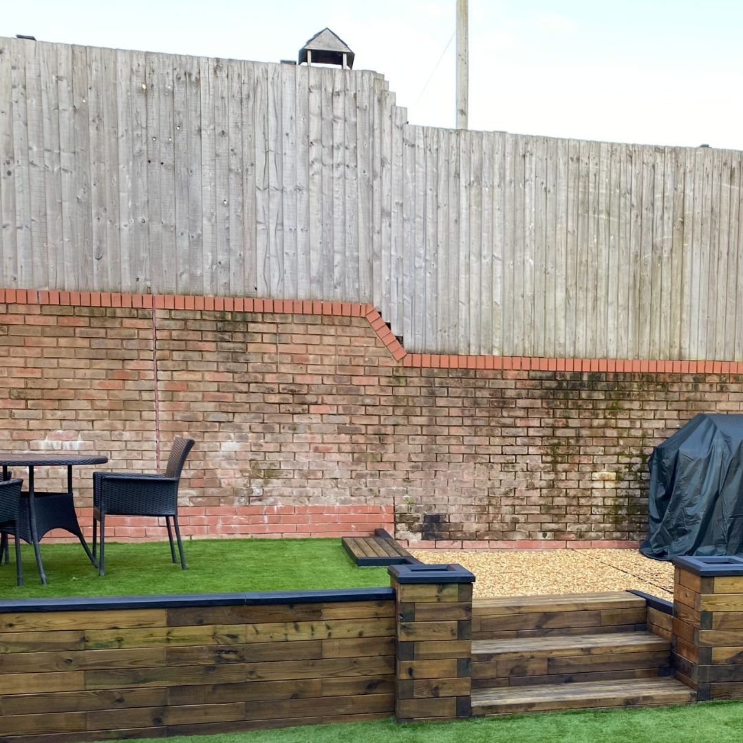 Flere af vores kunder har løst dette utrolig flot og har bygget videre på støttemuren for at skabe en kombineret støttemur, trin og bedkant i én samlet konstruktion – brug vores gratis designservice, hvis du er interesseret i denne type design. Vores kunder Ruth og James har brugt en lav støttemur til at skabe niveauer i deres nyanlagte have. Det viser virkelig alsidigheden i WoodBlocX, og hvordan det kan bruges til forskellige formål.