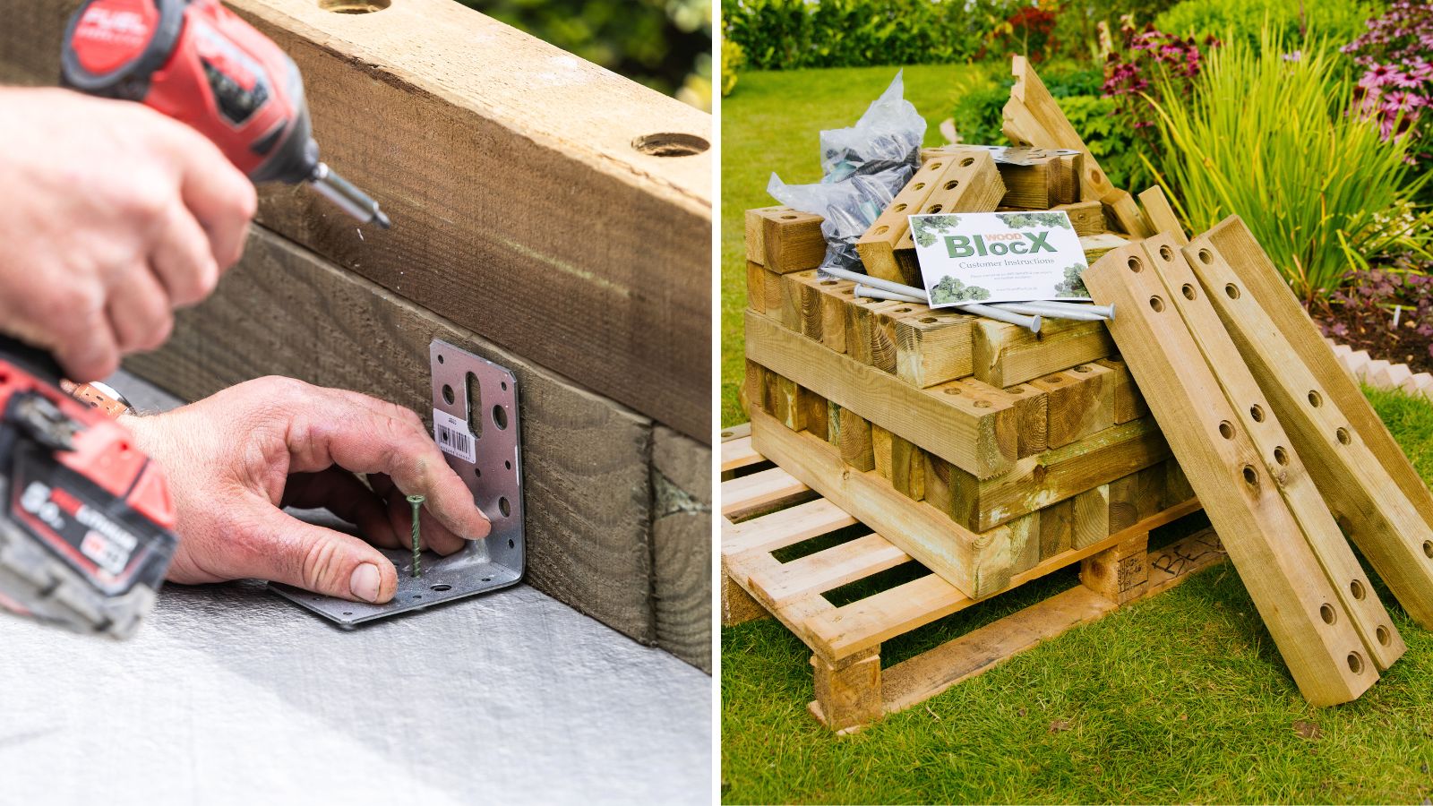 Da det meste af Barrys have allerede var meget plan og på niveau med terrassen, krævede det kun meget lidt tilpasning af underlaget før byggeriet. Når WoodBlocX skal bygges på et hårdt underlag, som en terrasse eller fliser, leverer vi vinkelbeslag, som bruges til at forankre strukturen til underlaget.