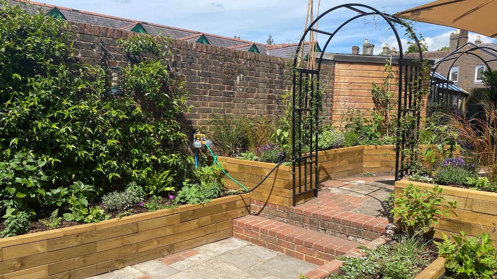 Barrys have blev som forvandlet! Vores modulopbyggede system i træ passer perfekt til haven, og det giver mulighed for at lave unikke strukturer med vinkler og forskellige niveauer. Han var meget opmærksom på, hvordan det naturlige træ i WoodBlocX ville se ud sammen med de eksisterende mursten og fliser, og som billederne bekræfter, var kombinationen af materialer det perfekte match.
