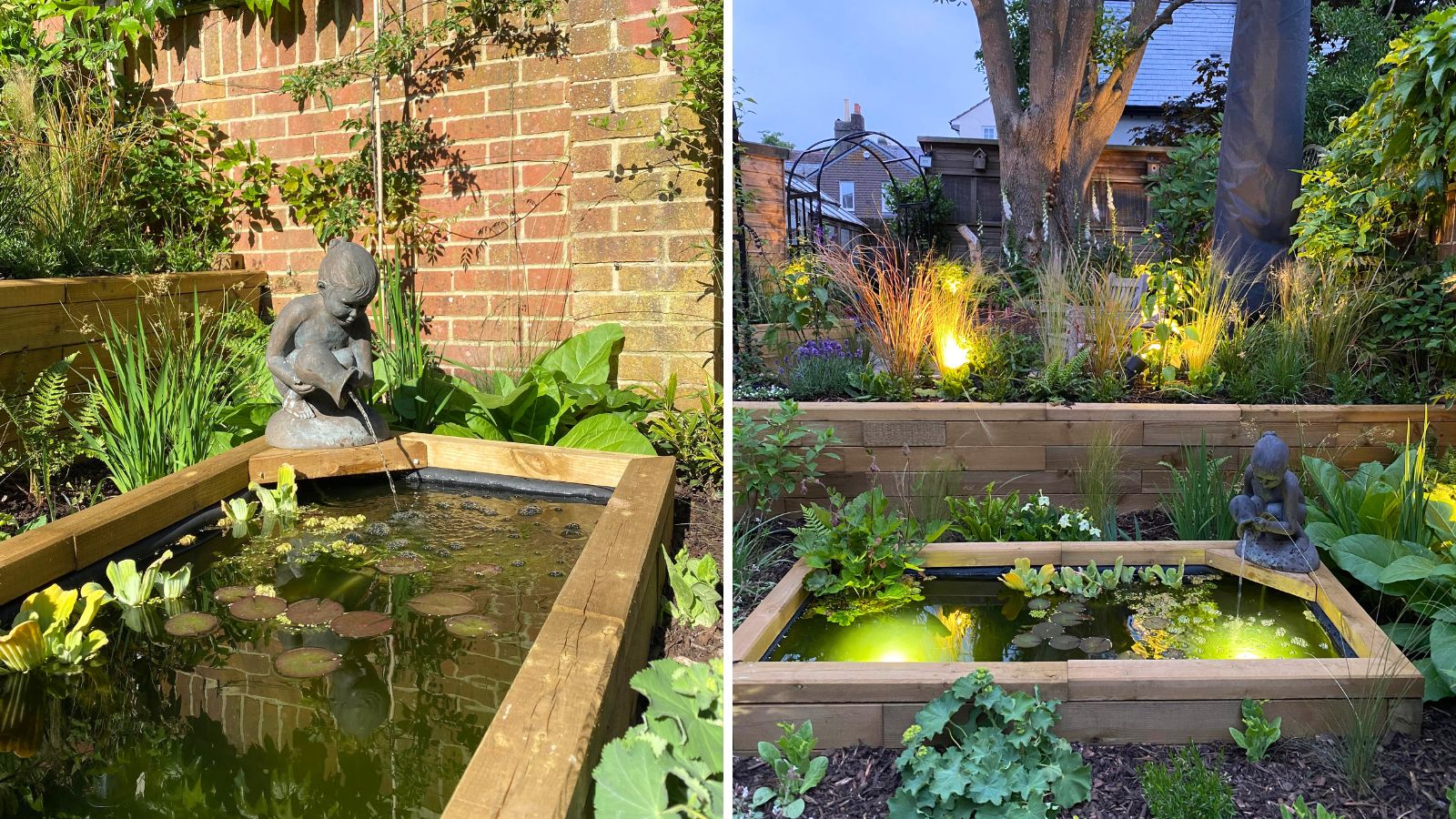 Det lille havebassin skaber ro og er med til at tiltrække ekstra dyreliv i haven. Barry installerede en fontæne i hjørnet af bassinet, som sikrer, at vandet bliver iltet og er i bevægelse.
