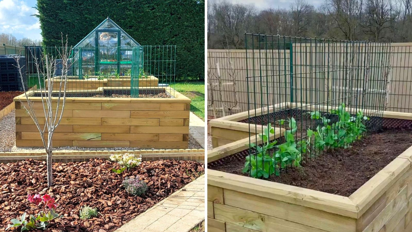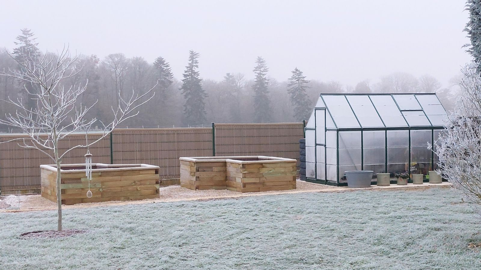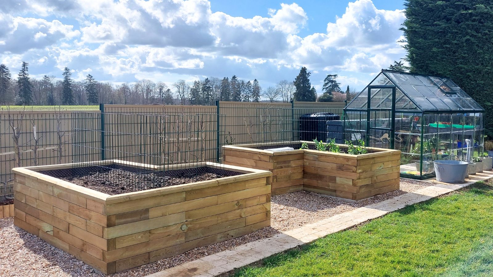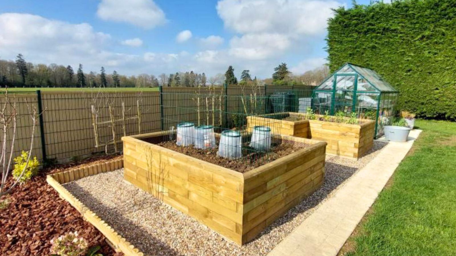 Højbedene er perfekt placeret tæt på drivhuset, og stien fører til baghaven. Det gør det nemt for Laure at så frø i drivhuset og flytte stiklinger til højbedene, når de er klar til at vokse. Nu, hvor højbedene er fyldt med jord, planlægger Laure at dyrke courgetter, pærer, gulerødder, radiser, agurker, tomater og salat, og hun vil også forsøge sig med at dyrke meloner!