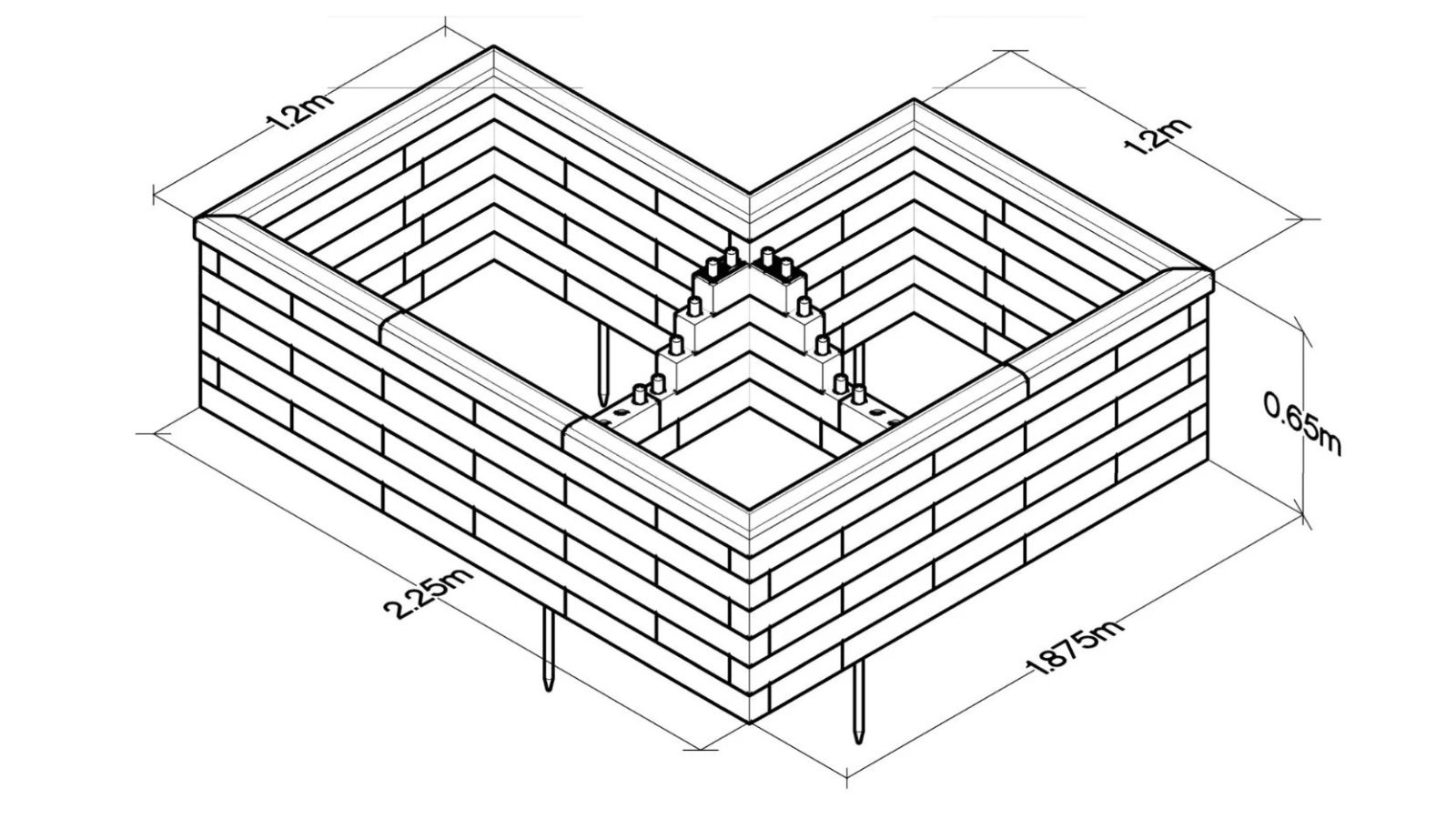Da der skulle bygges på et hårdt underlag, leverede vi vinkelbeslag til at fastgøre det nederste lag blokke til fundamentet. Hvis du bygger på et blødt underlag som jord eller græs, kan du i stedet få leveret jordspyd med din ordre. Jordspyddene kan du hamre ned i jorden for at forankre strukturen.