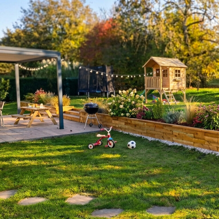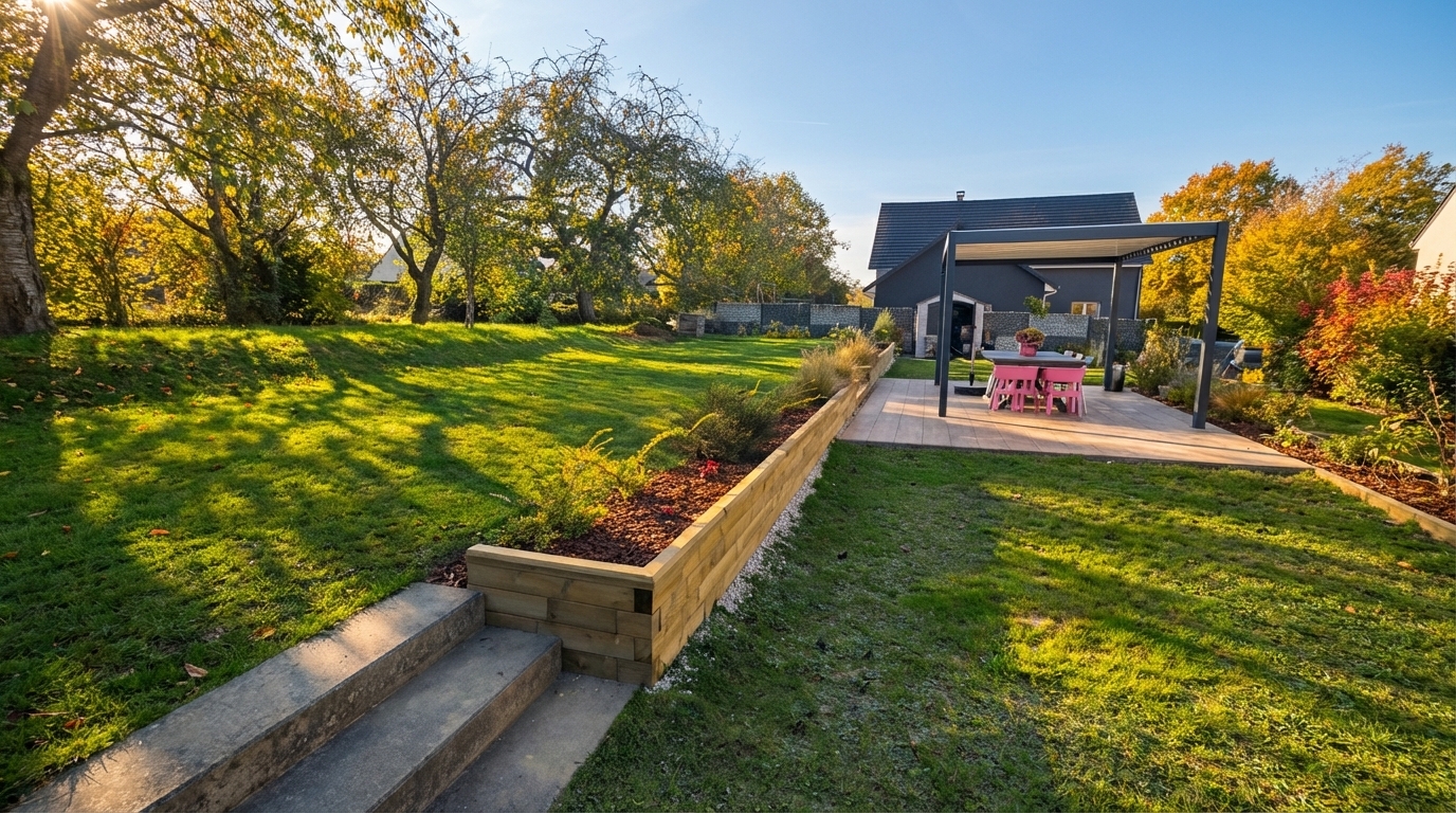 Thibauts have er indrettet med en lavtliggende terrasse og en stor højereliggende græsplæne. Mellem de to områder er der en skråning, der ikke er udnyttet optimalt. Thibaut vil gerne have en løsning, der kan binde de to områder sammen på trods af skråningen. Med en WoodBlocX-støttemur har han mulighed for at få en æstetisk flot konstruktion, der kan holde i mange år.