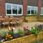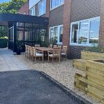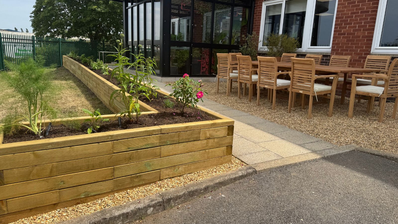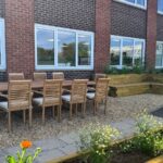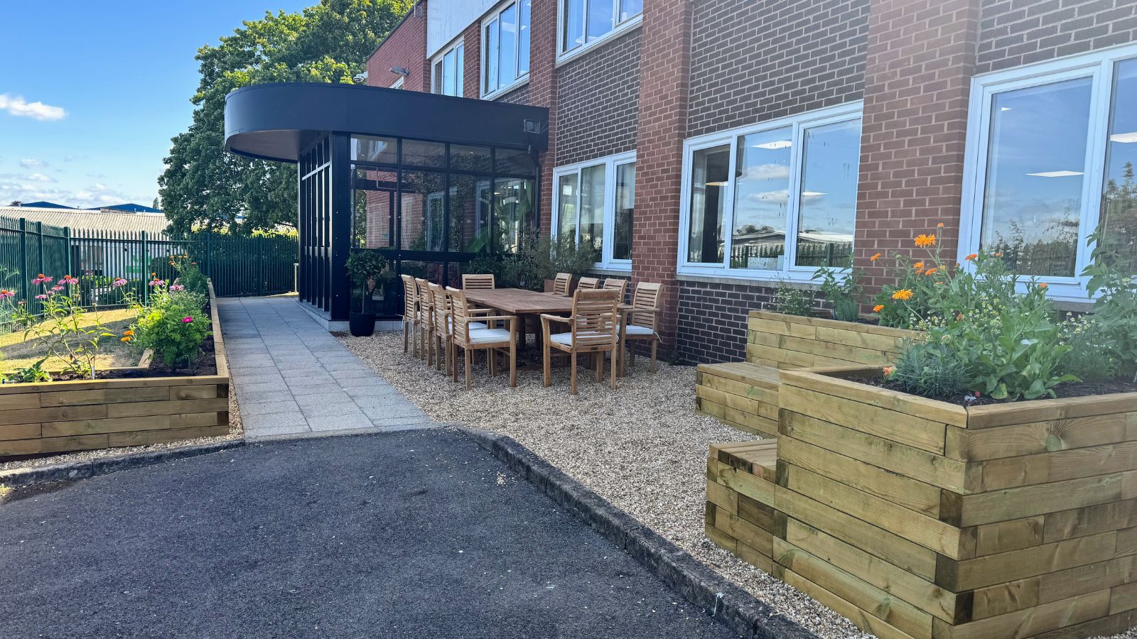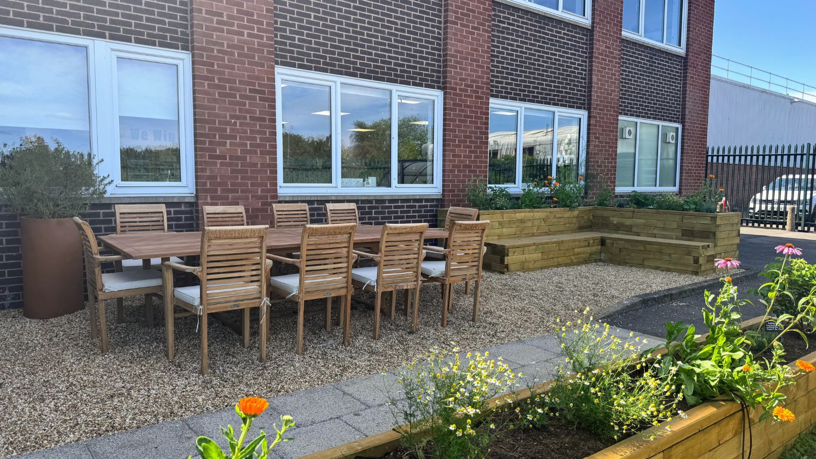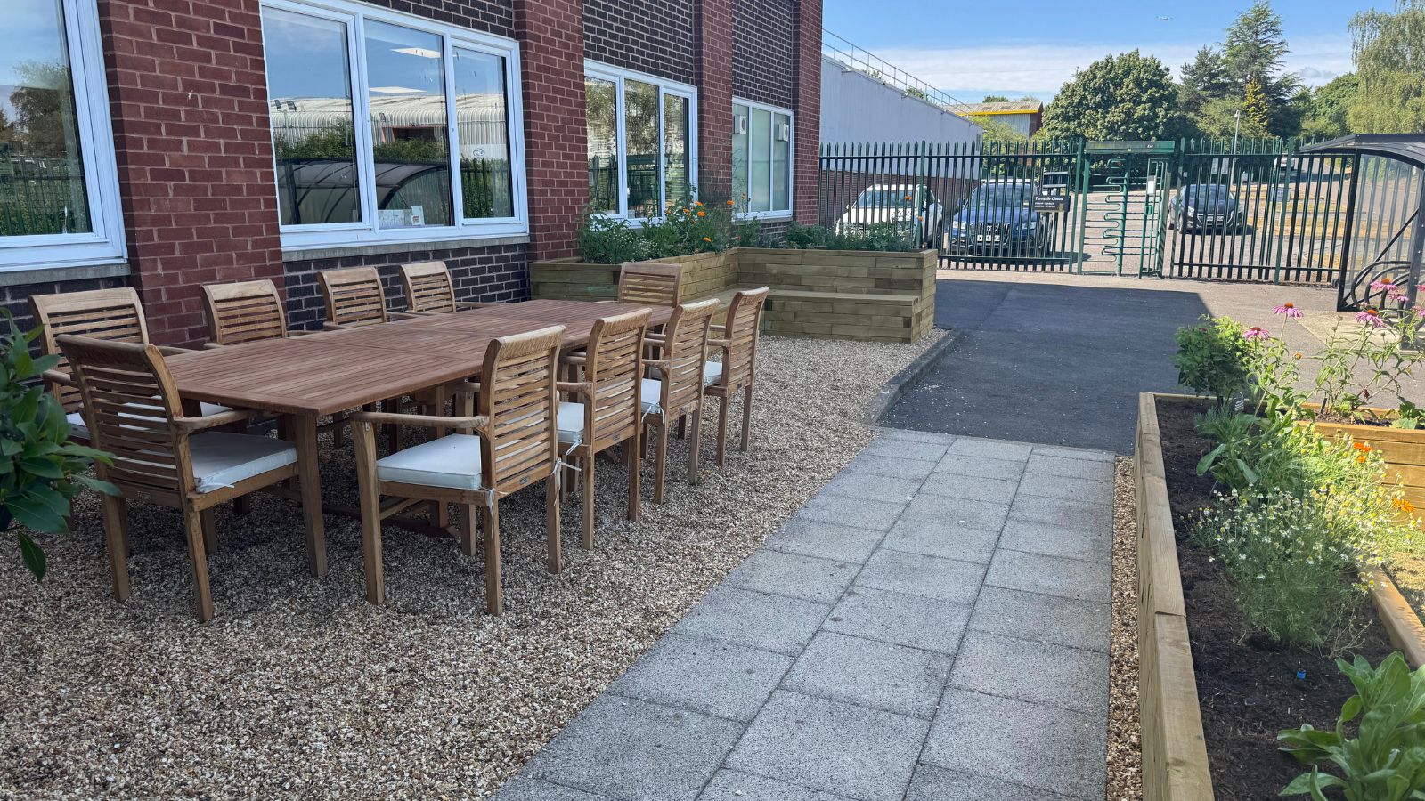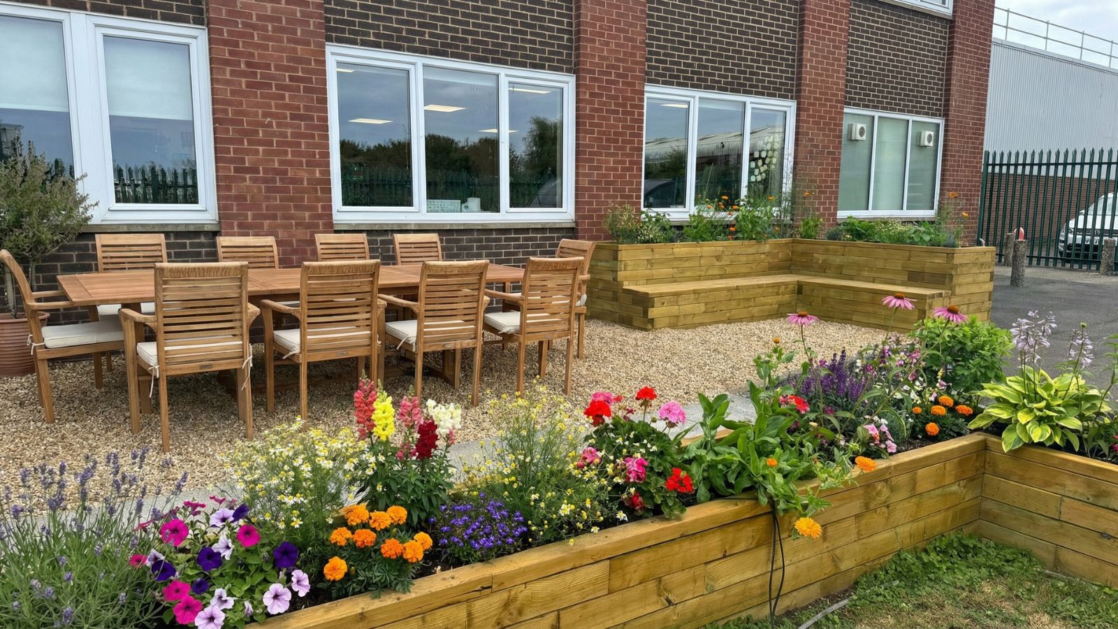 Det L-formede højbed med integreret bænk på den modsatte side passer også perfekt til området. Det har givet flere siddepladser ud over det nye bord og de nye stole. Udendørsområdet er nu et hyggeligt sted, hvor medarbejderne kan samles.