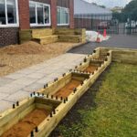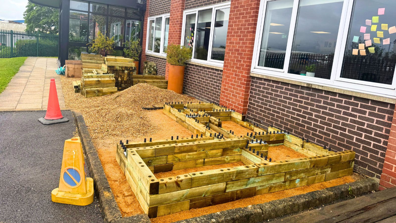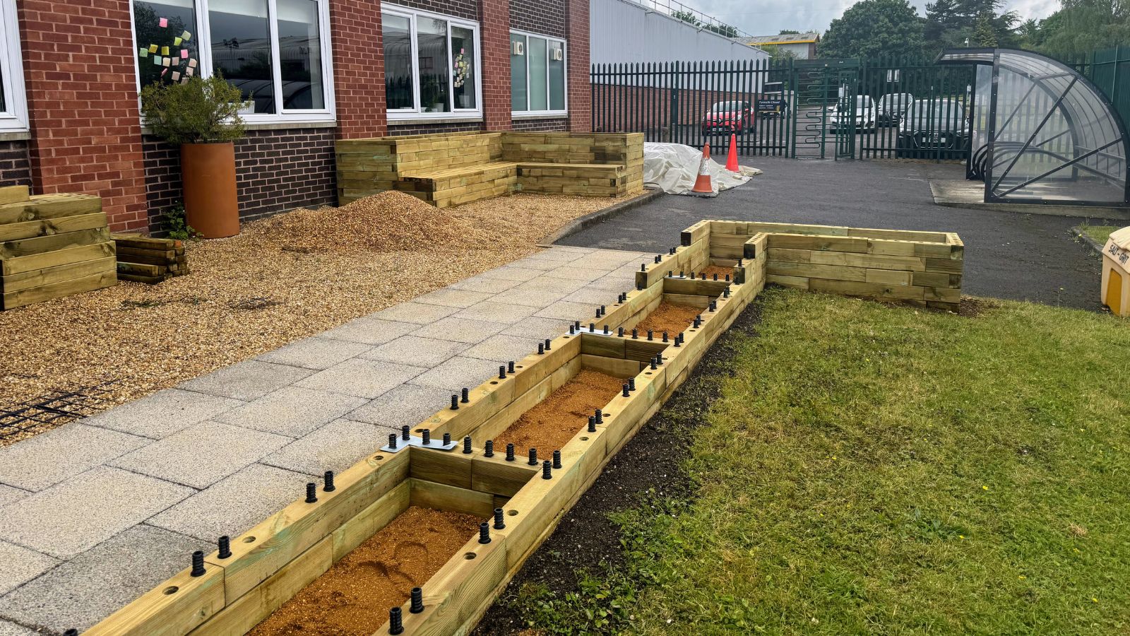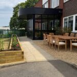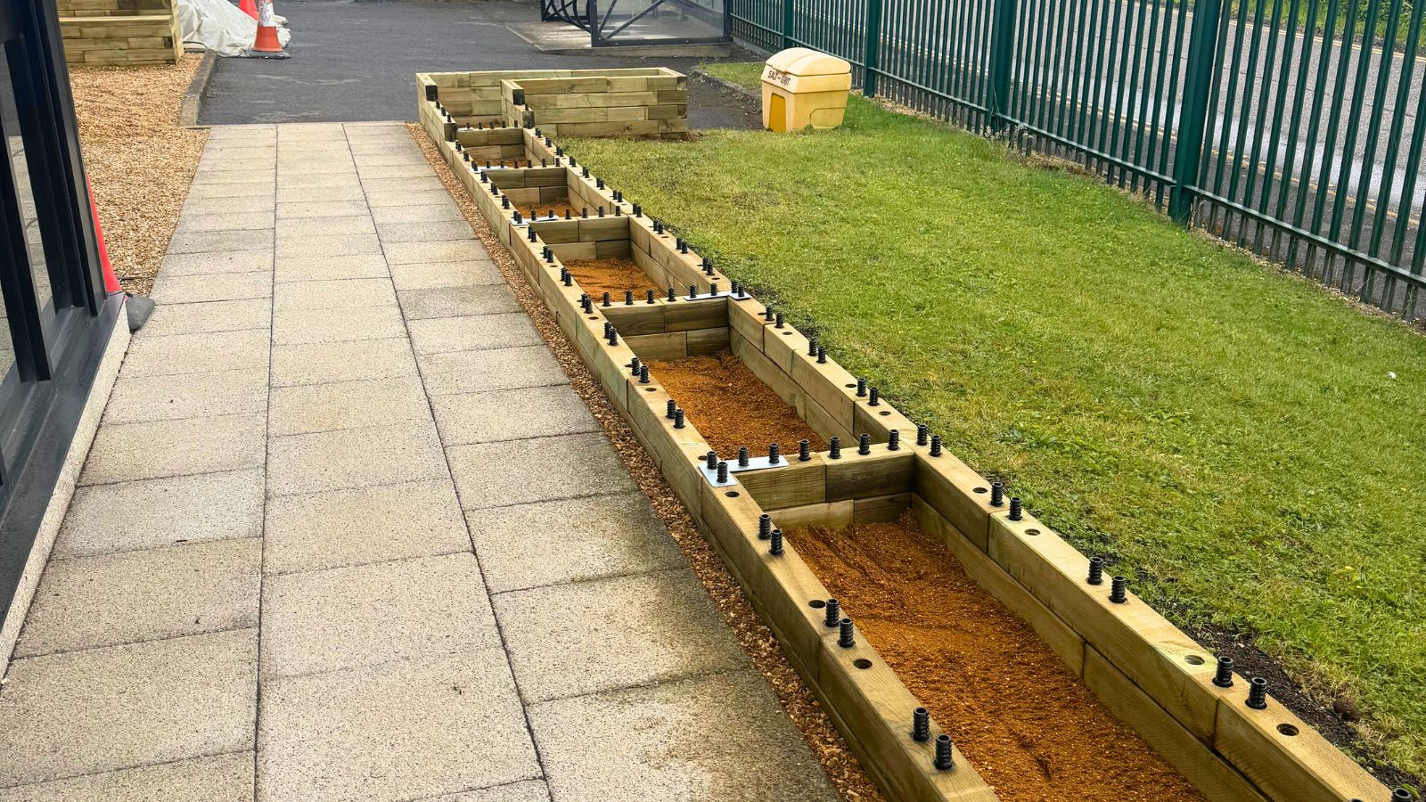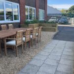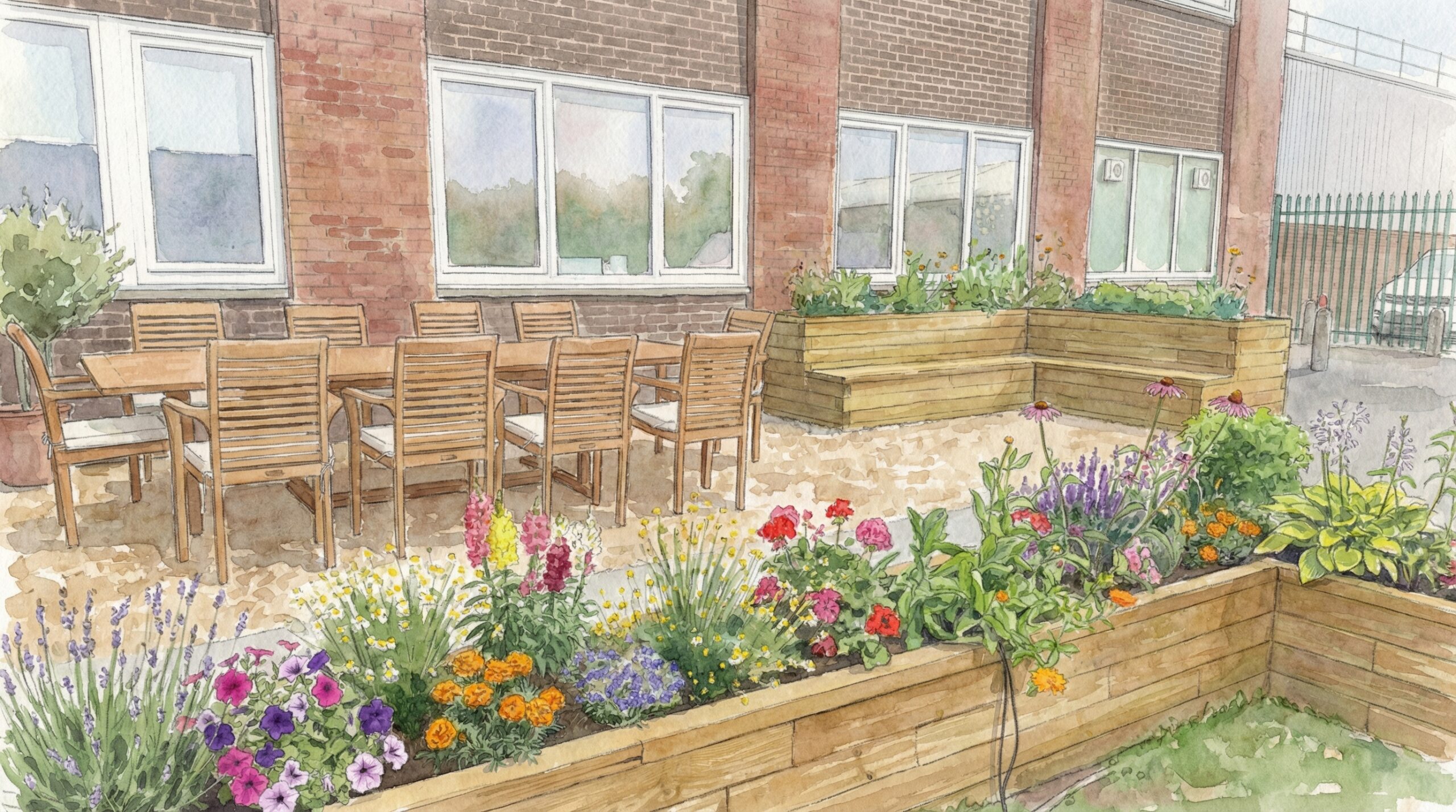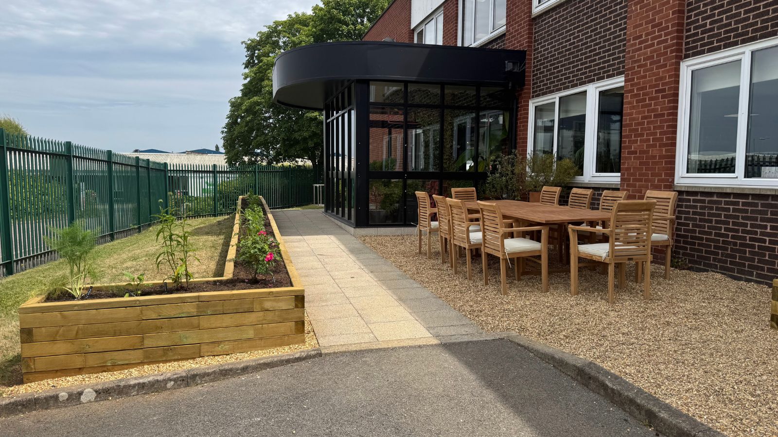 Det L-formede højbed med integreret bænk på den modsatte side passer også perfekt til området. Det har givet flere siddepladser ud over det nye bord og de nye stole. Udendørsområdet er nu et hyggeligt sted, hvor medarbejderne kan samles.