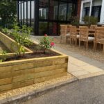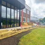 Udendørsområdet hos Twinings er blevet virkelig flot! Det lange L-formede højbed indrammer indgangspartiet og skaber en indbydende sti til bygningen. Det nye område med højbedet har masser af plads til planter og små buske, som medarbejderne kan nyde året rundt.
