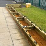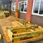 Grunden havde en skråning på det sted, hvor det lange L-formede højbed skulle placeres, så det krævede lidt klargøring af området. Der blev fjernet græstørv og lagt stabilgrus for at sikre, at underlaget var helt plant, inden samlearbejdet kunne starte. Der blev gjort et imponerende arbejde med at klargøre området, og vores byggevejledning blev fulgt til punkt og prikke.