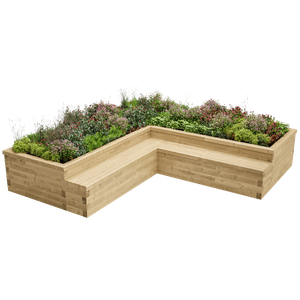 Dette store L-formede højbed med integrerede siddepladser er et flot design, der giver plads til flotte blomster og planter i hjørnet af haven, og du får samtidig et sted, hvor du kan sidde og slappe af.