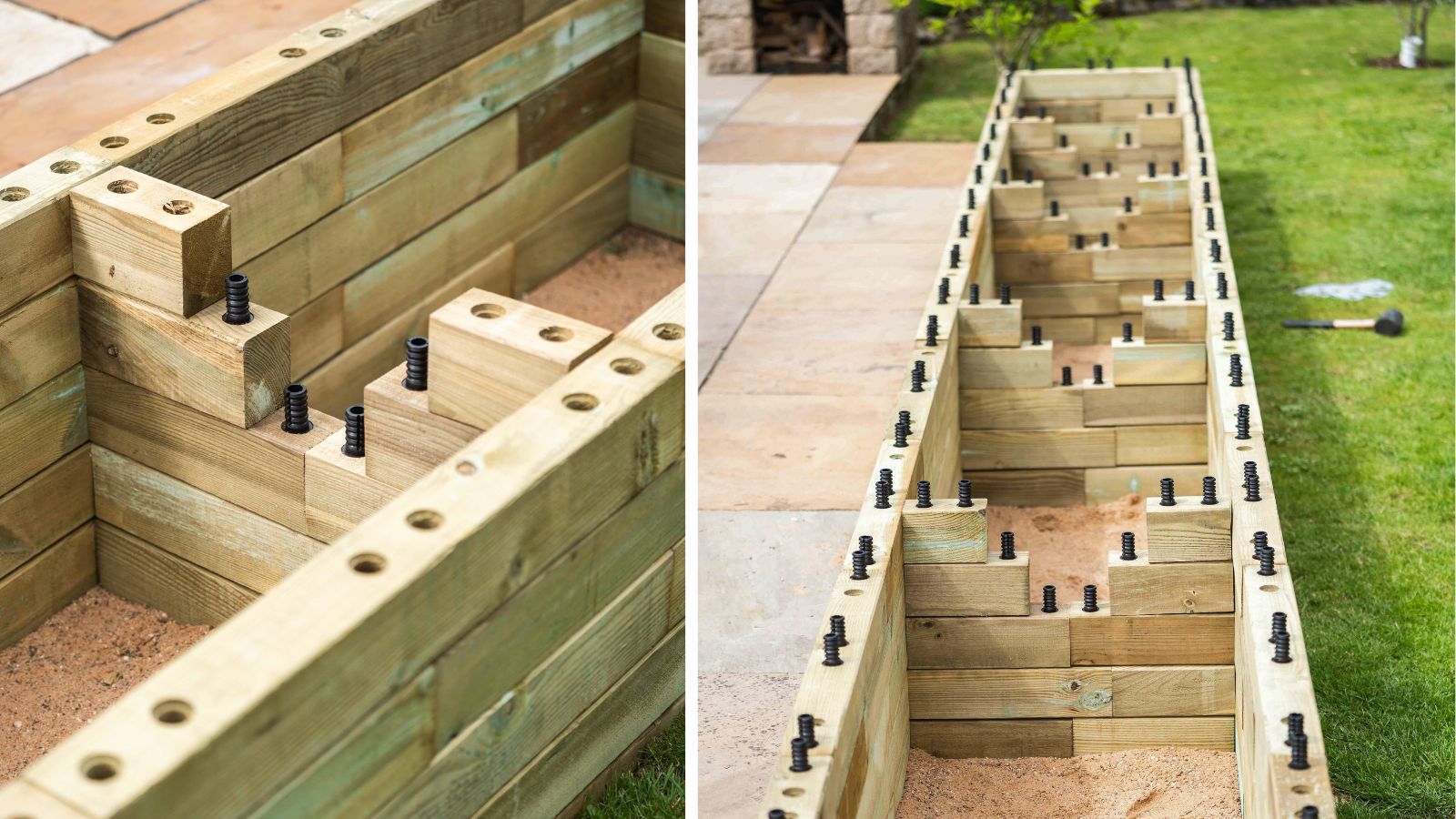Hvis du bygger dit WoodBlocX-højbed på åben jord eller græs (blødt underlag), skal du montere en folie på indersiden af væggene og over støtteblokkene, og du kan lade bunden af højbedet være åben for at sikre en god dræning. Hvis du bygger på et blødt underlag som jord eller græs, og det er fugtigt, anbefaler vi, at du bygger højbedet på en åndbar plastfolie for at give ekstra beskyttelse under højbedet.