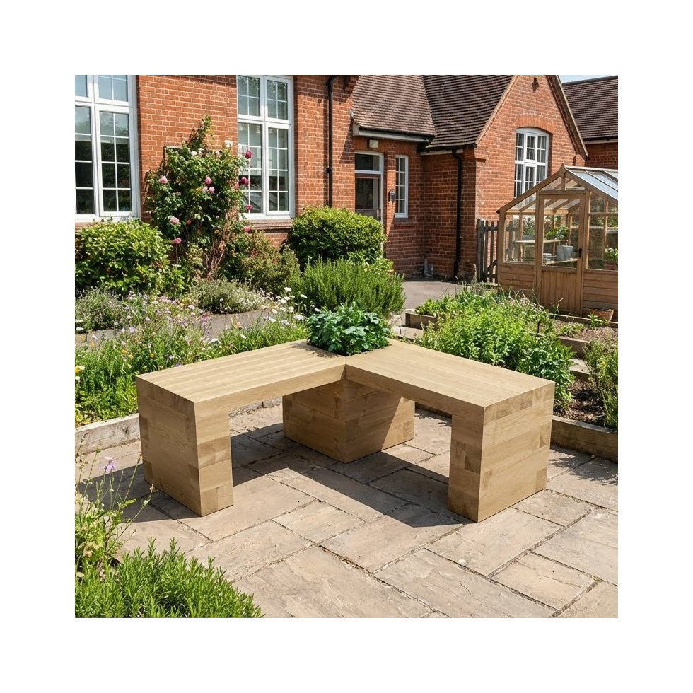 Bænkens sædehøjde: 45 cm. Sædelængde: 75 cm (L-formet). Der er en lille plantekasse i hjørnet, der har en indvendig størrelse på 30 cm x 30 cm x 45 cm høj. Fremstillet af bæredygtigt indkøbt behandlet træ.