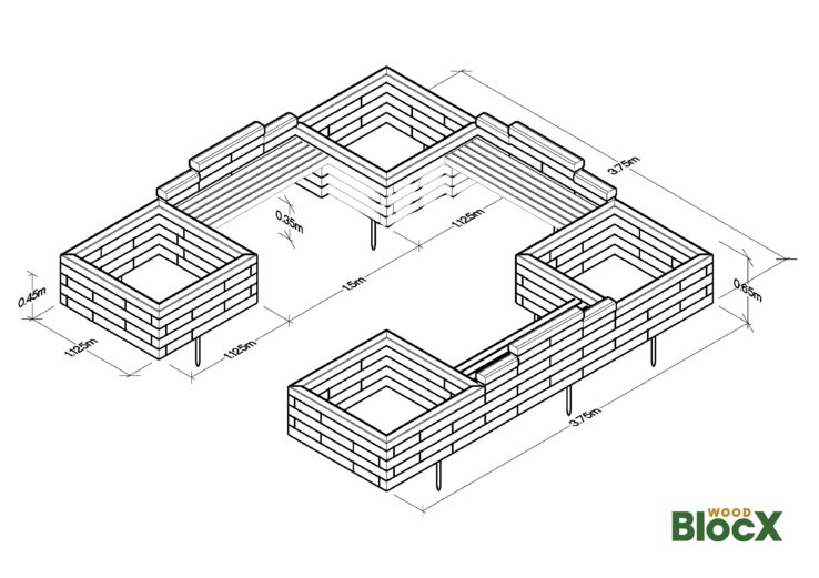 triple planter seat , dette design har længere træbænke, så flere små kan nyde deres tid sammen. Fantastisk til en skole eller børneklubhave, dette u-formede havekit vil virkelig give børnene et sted at være udenfor og plante en have, og de voksne et fristed til at nyde en fredelig solrig eftermiddag. Bænkens sædehøjde: 35 cm.