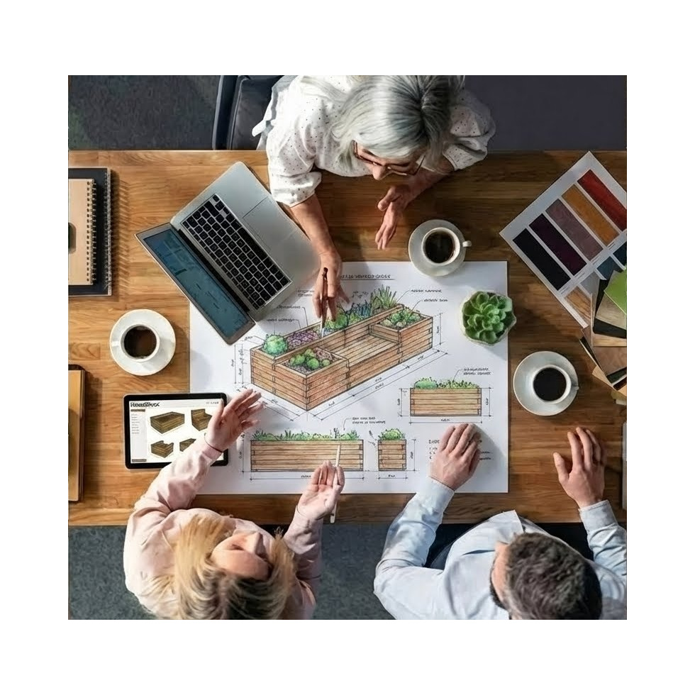 Vores designteam har mange års erfaring med at designe skræddersyede haveløsninger ved hjælp af WoodBlocX, så de kan helt sikkert også hjælpe med dit projekt. Vores service er GRATIS med et ubegrænset antal ændringer, indtil du er klar til at bestille. Når du bruger vores service, er du ikke forpligtet til at handle hos os.
