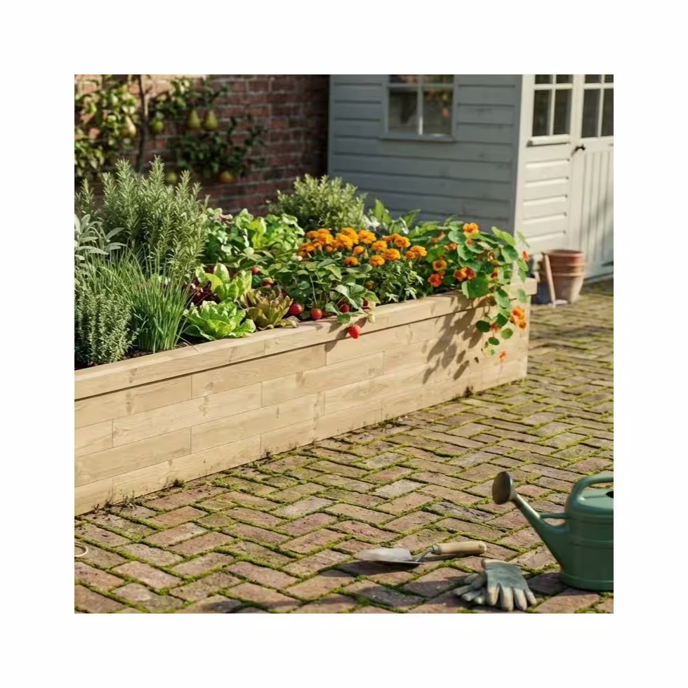 En rektangulær hævet havebed, der tilbyder et stort rum til at komme i gang med at dyrke. At bruge WoodBlocX til at skabe et stort bed er meget lettere end tunge, beskidte træskinner, og det forstærkede design samt den stærke WoodBlocX-konstruktion forhindrer, at træet bøjer, hvilket kan ske med planker.