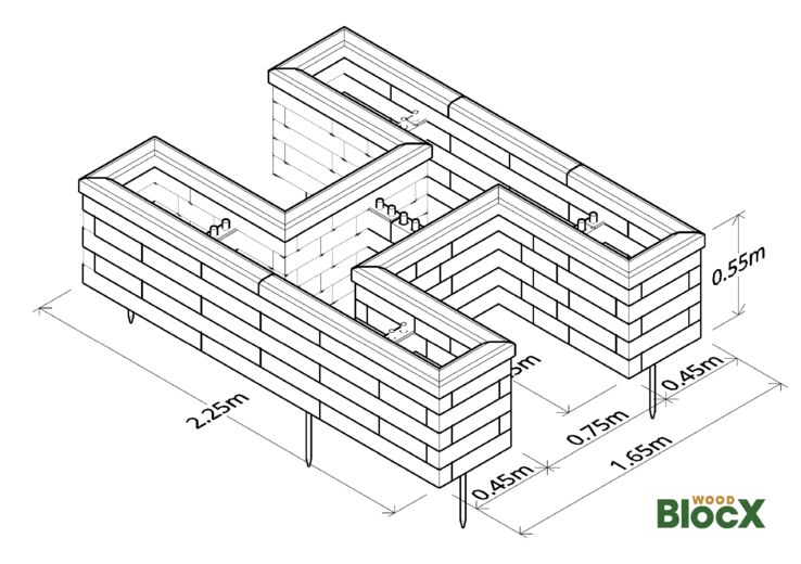 H-formet træplantekasse 225 x 165 x 55 cm