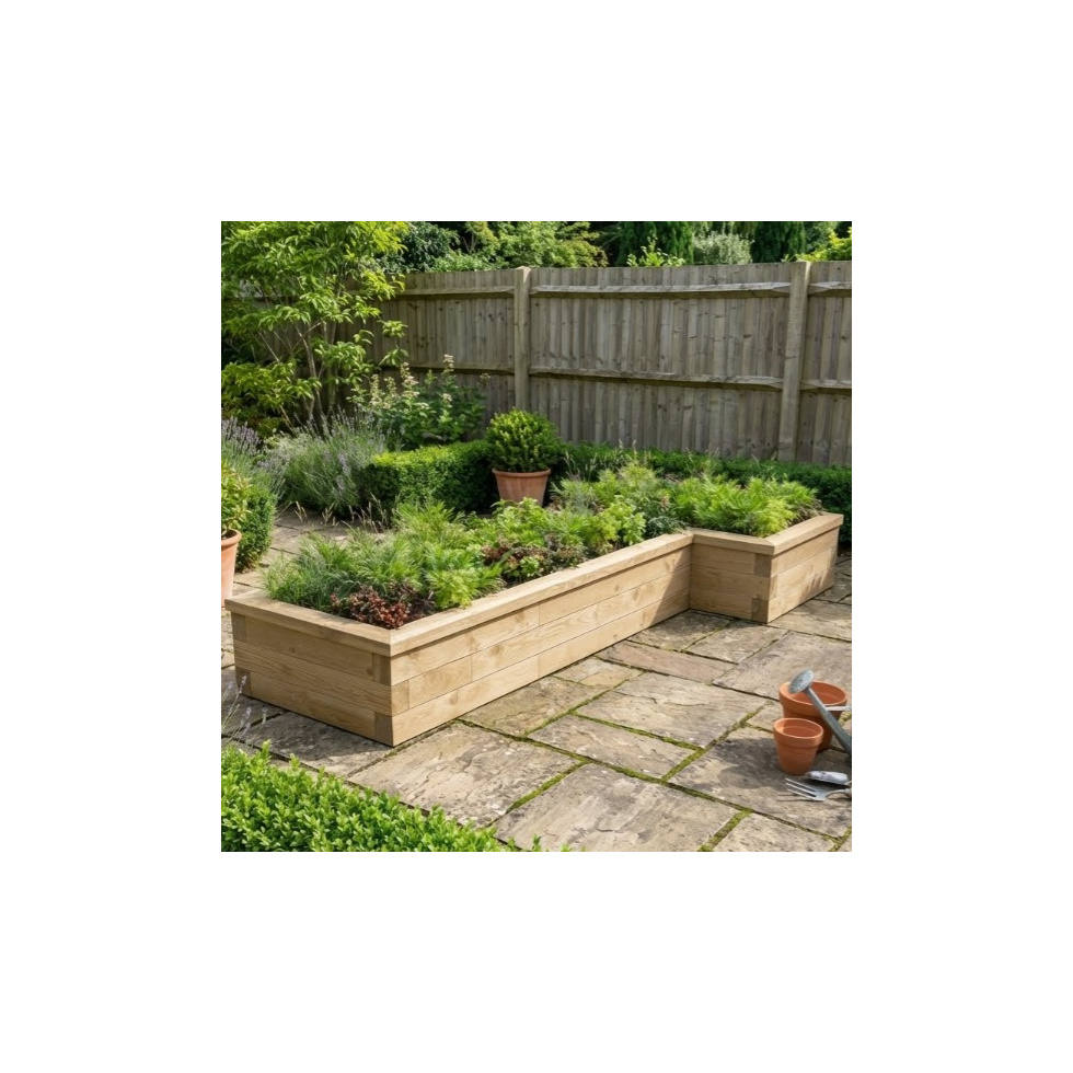 Vil du ændre dette L til et T? Tee off og kom i gang med vores free bespoke design service og opnå dit have mesterværk! Hvis formen på dette design er, hvad du ønsker, men målene ikke helt passer til dit rum, så brug vores specifikke L-formede hævede bed calculator for at skabe en seng efter dine egne specifikationer.
