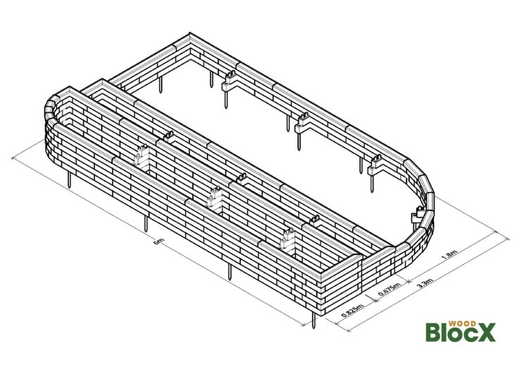 * Hvis du skal bygge på et blødt underlag, medfølger der jordspyd i dit samlesæt. Jordspyddene (400 mm spyd i galvaniseret stål) bruges til at fastgøre strukturen i underlaget. Spyddene skal monteres, når du bygger det nederste lag af dit design.