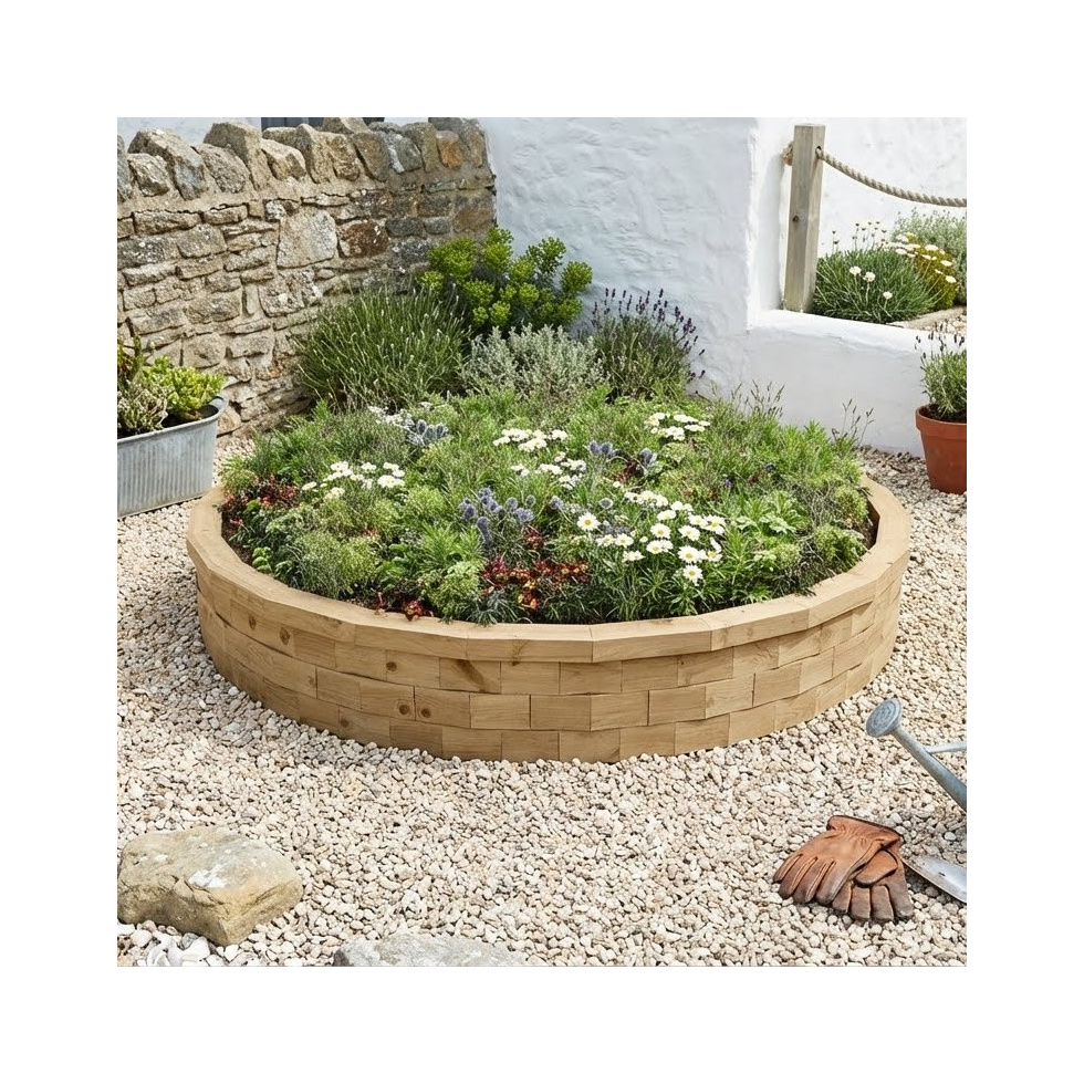 Dette store cirkulære hævede bed er et ideelt sæt til at skabe et imponerende trædesign som midtpunkt i den moderne have. At tilføje buede trækrukker kan gøre underværker i rektangulære haver og give blødere linjer til et struktureret rum. Hvorfor ikke endda kombinere det med nogle hjørnebuede krukker for at skabe en virkelig unik og storslået potagerhave?