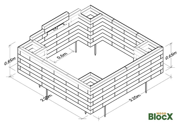 * Hvis du skal bygge på et blødt underlag, medfølger der jordspyd i dit samlesæt. Jordspyddene (400 mm spyd i galvaniseret stål) bruges til at fastgøre strukturen i underlaget. Spyddene skal monteres, når du bygger det nederste lag af dit design.